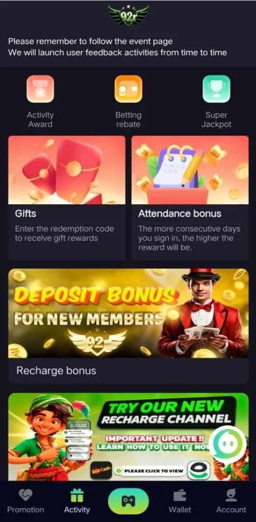 92 R offers daily gift codes that give free balance, spins, or deposit bonuses.