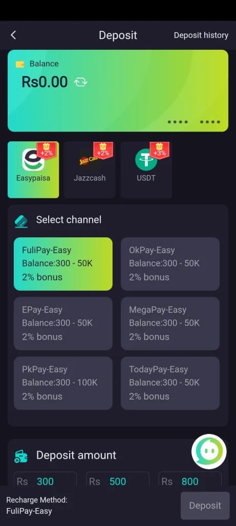 The minimum deposit is ₨300, and the minimum withdrawal starts from ₨500, supporting JazzCash, Easypaisa, and USDT.